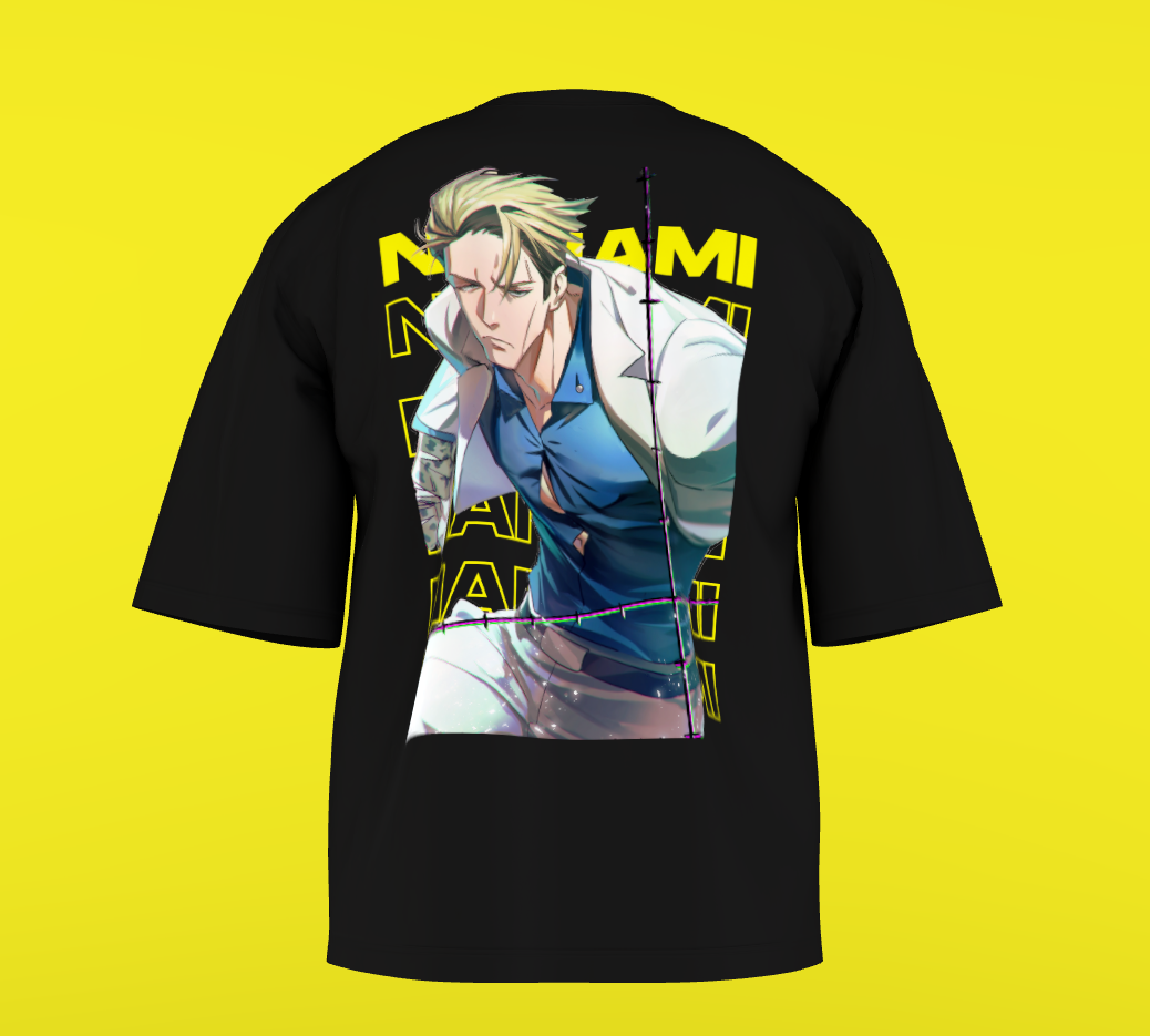 This premium black t-shirt features a striking back design showcasing the fan-favorite character Nanami Kento from the popular anime "Jujutsu Kaisen":