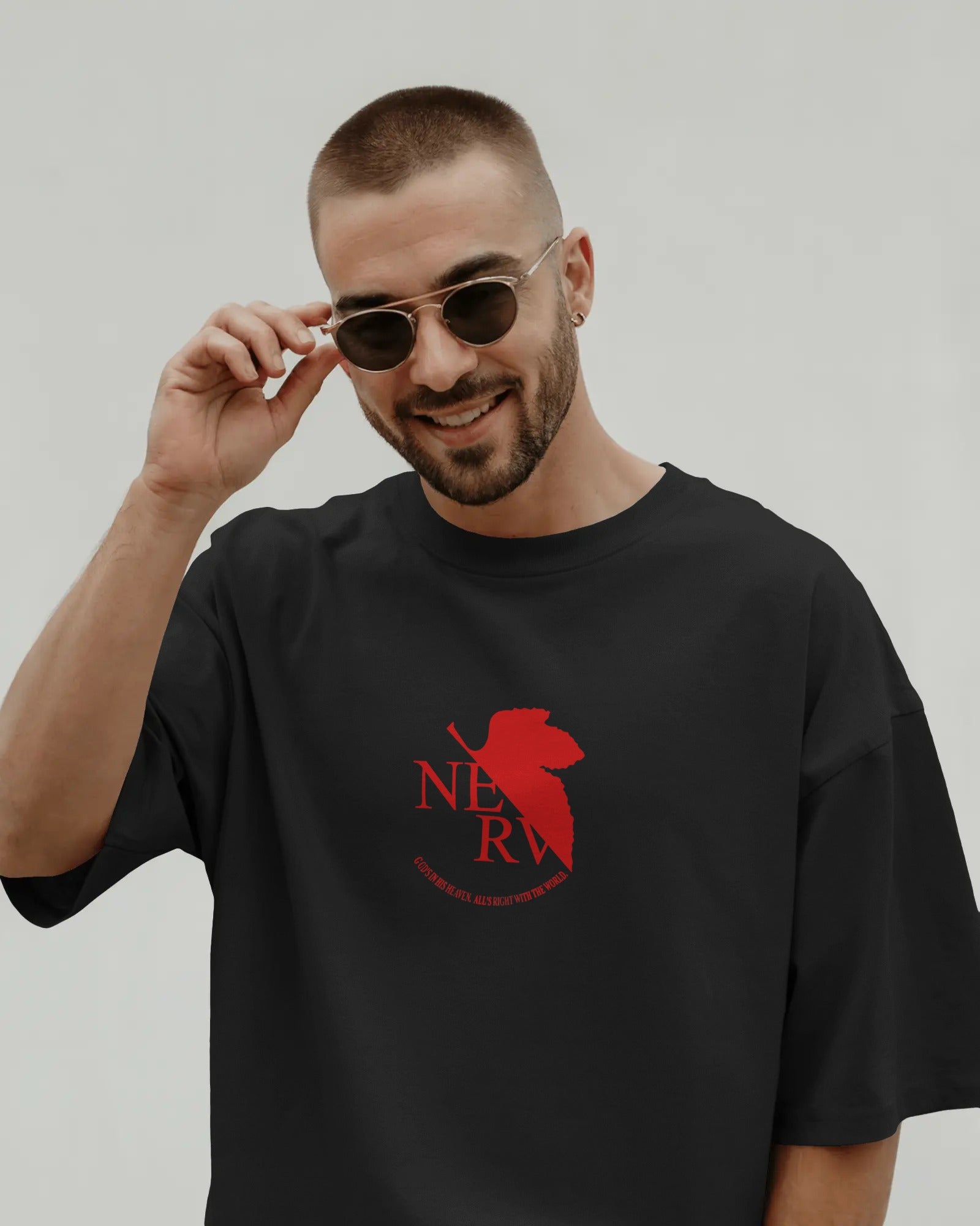 This premium black oversized t-shirt features striking Evangelion artwork with complementary front and back designs: